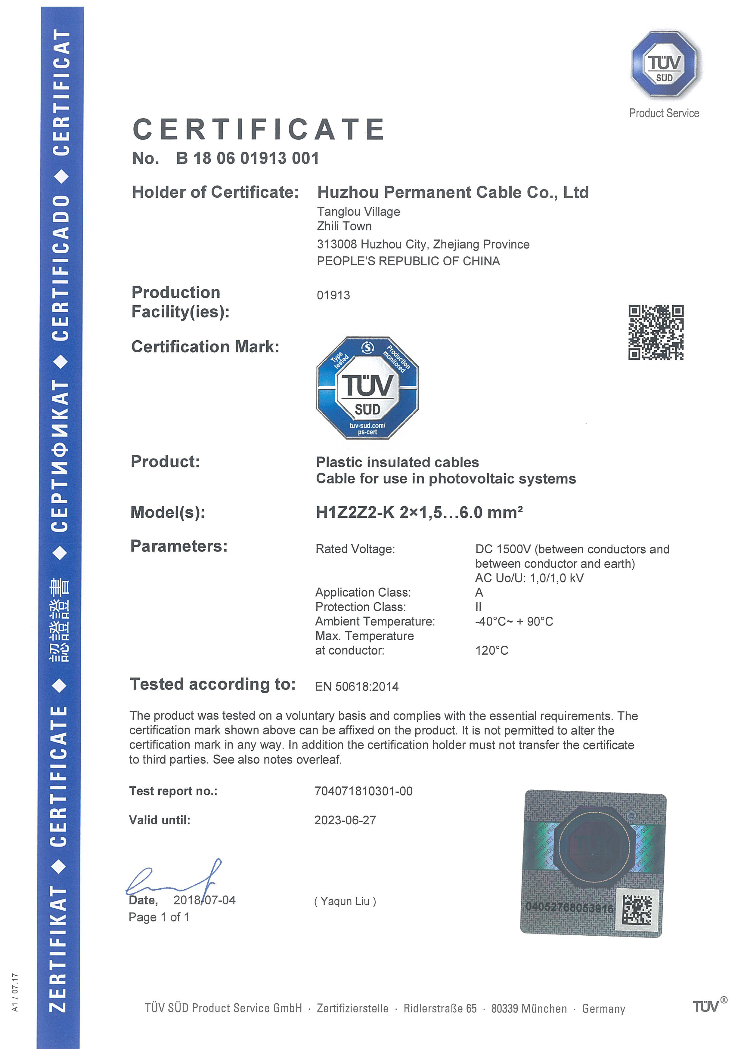 2016年--2018年,我司先后獲得了CE證書和TUV證書, 通過了SGS的第三方驗廠。2017年-2018年,2年的時間內(nèi),在新能源領(lǐng)域--光伏電纜, 取得了重大進(jìn)步。